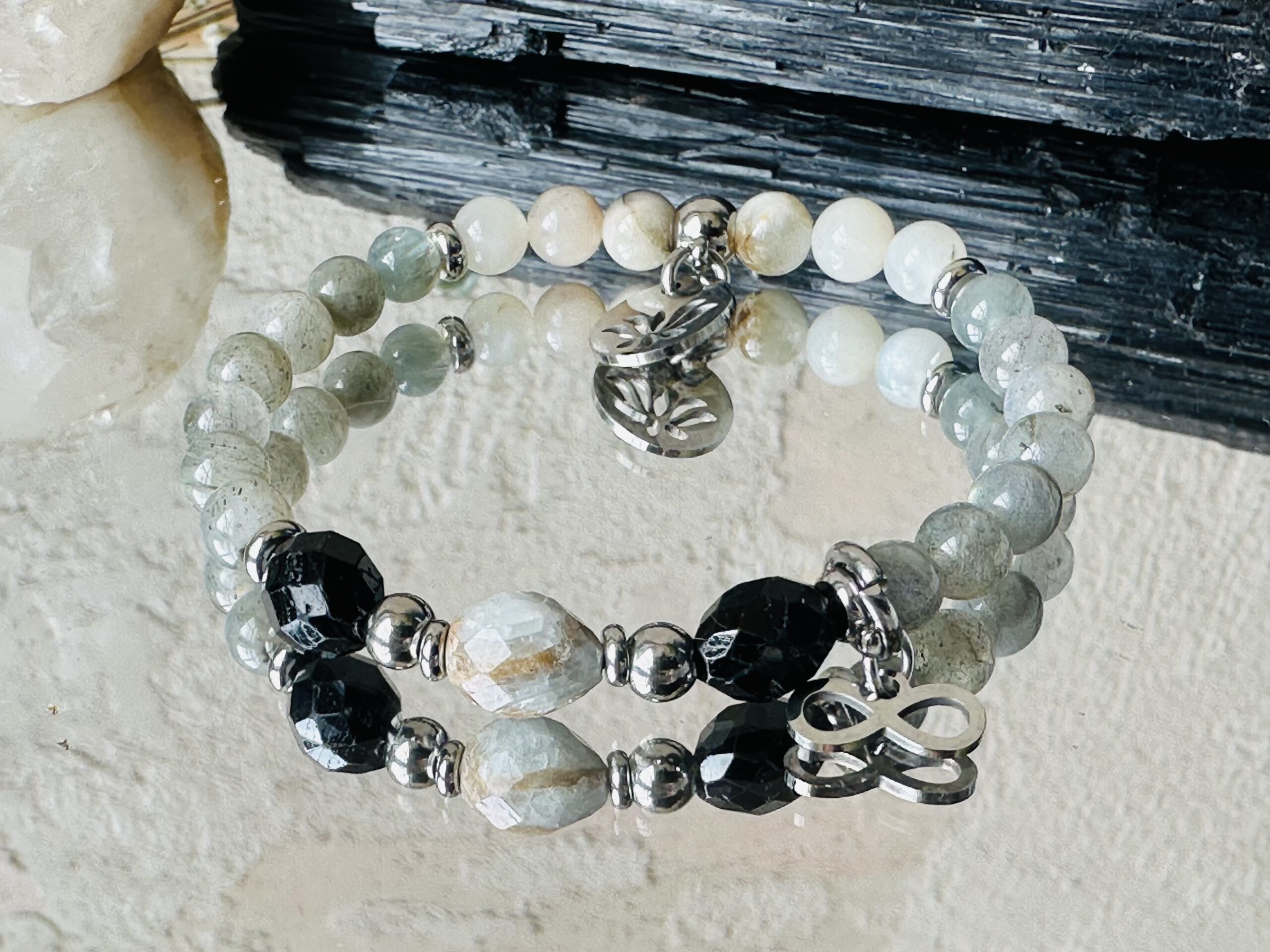 Bransoletka z Czarnym Turmalinem, Labradorytem i Kamieniem Księżycowym ” Claria” klarowność, jasność, intuicja